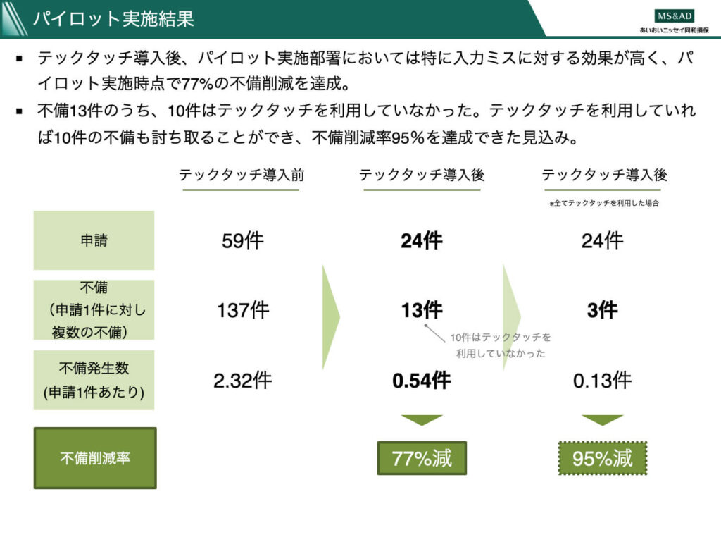 パイロット導入の実績では期待した通り、特に入力ミスの削減に高い効果が現れました。期間中、入力不備が137件→13件に削減でき、1回の申請あたりの入力不備項目が2.32件→0.54件に激減しました。さらに残りの不備13件中10件はテックタッチを利用しておらず、テックタッチ利用により10件の不備も解決したと見込まれます。結果、不備削減率は95%に達すると考えています。