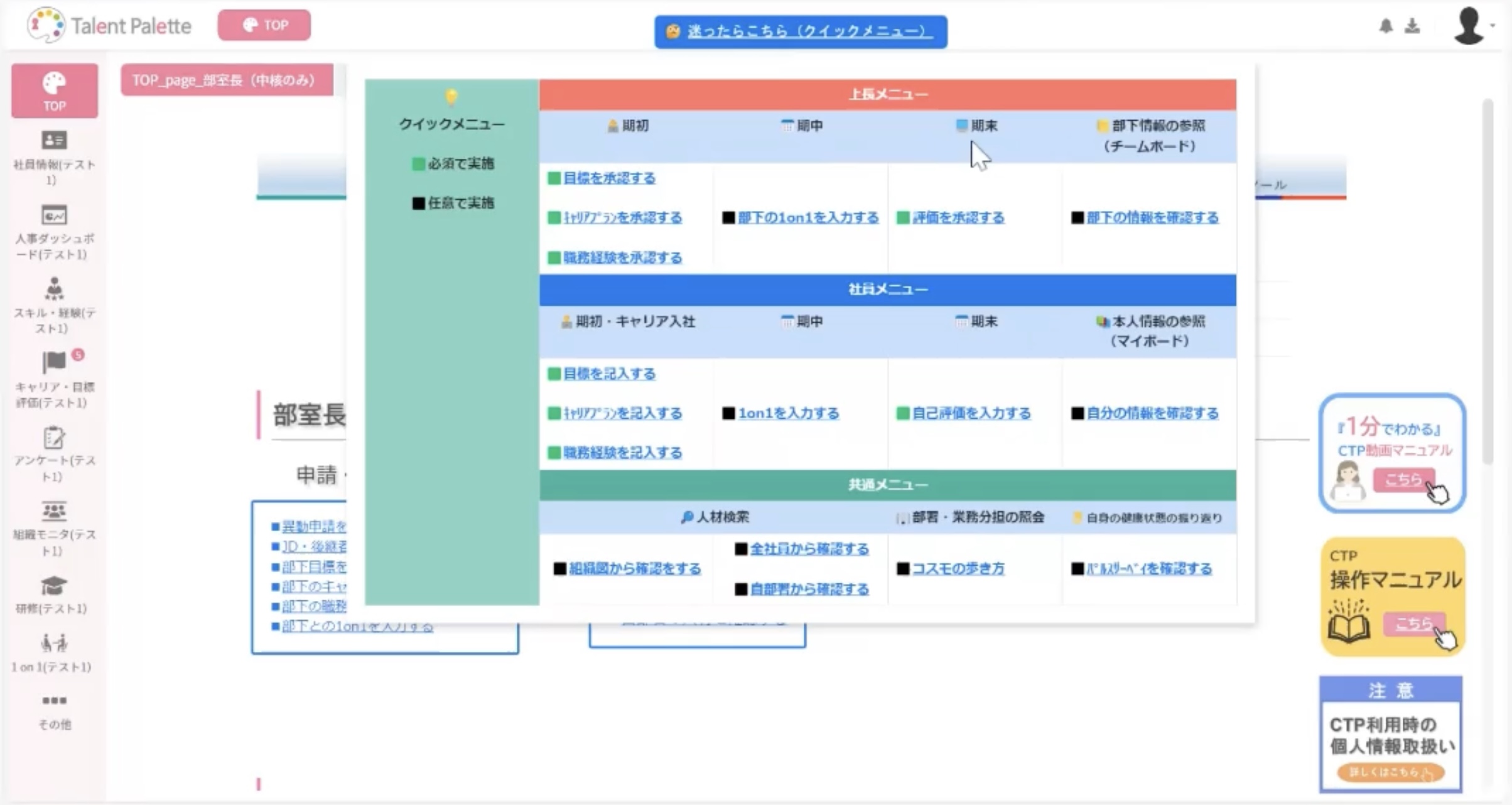 また、「タレントパレット」にログインした際のTOPページでは、役職に合わせたメニューを表示しており、システムで行うべき操作や見るべき情報のアクセスを、「テックタッチ」により確実に案内することで、利活用を促進しています。
