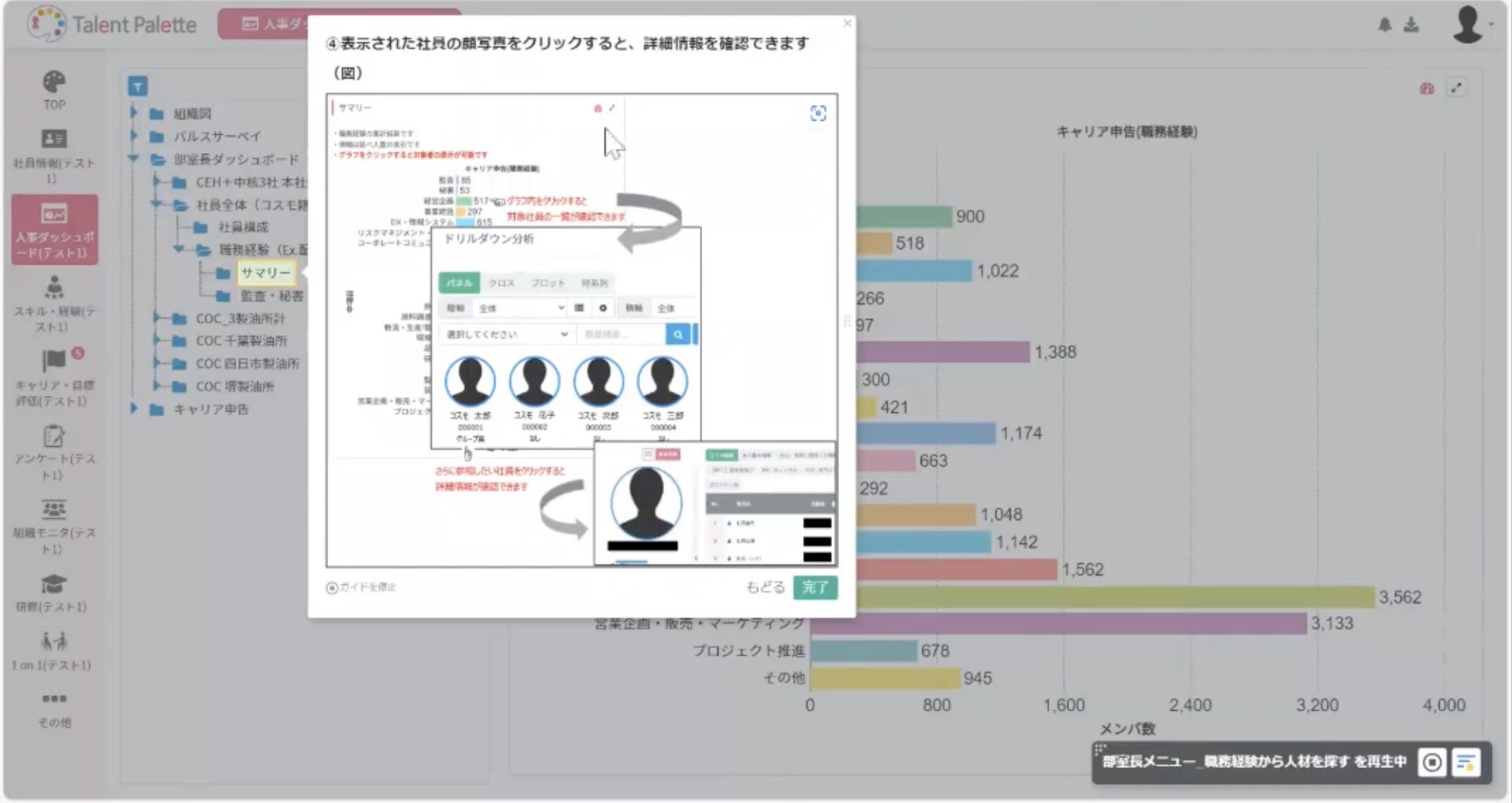 他にも、ツールチップを活用して、画面上での「グラフの見方」や「詳細情報を深掘りするための操作方法」などを表示することで、人事データ活用の高度化を実現しています。