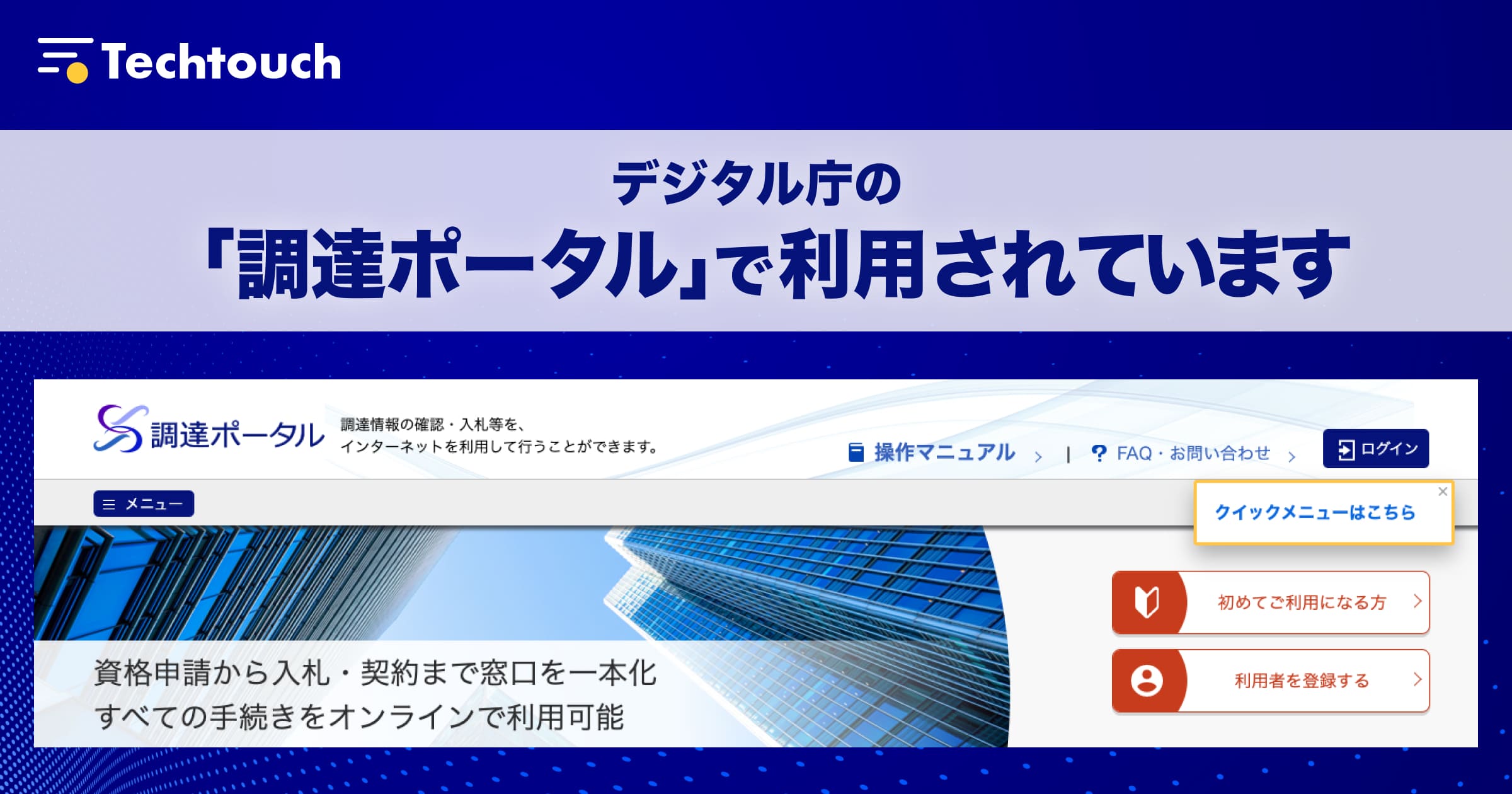 テックタッチ株式会社(本社:東京都港区、代表取締役:井無田仲、以下、当社)が提供する、ノーコードでガイド・ナビゲーションを設置可能なSaaS「テックタッチ」が、デジタル庁が運用する「調達ポータル」(※)に利用されていることをお知らせします。