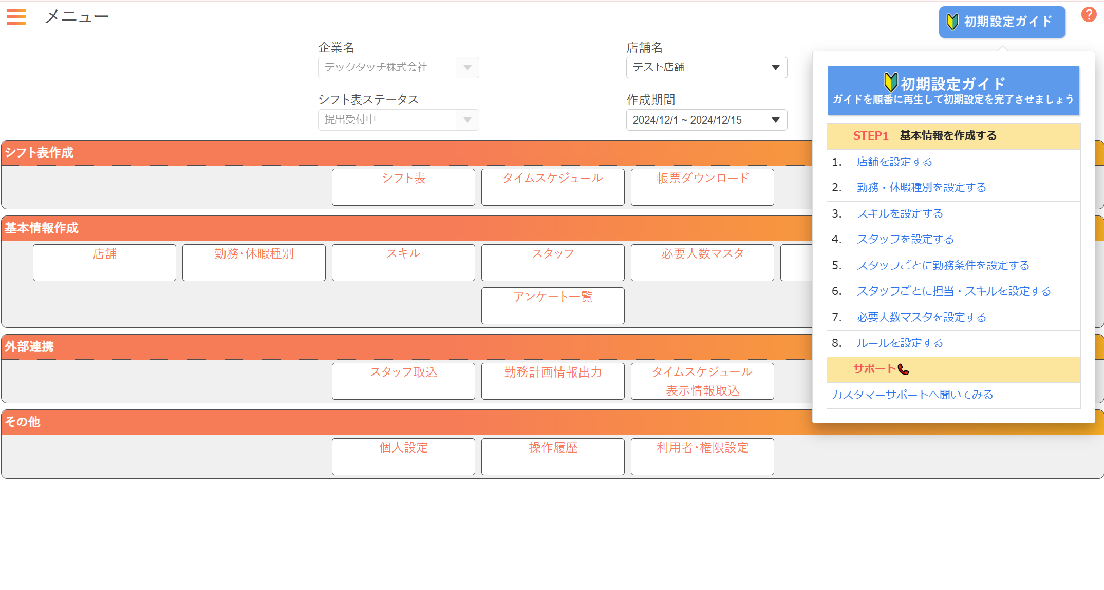 JRシステムが提供する「勤務シフト作成お助けマンTime」は、最適化AIを活用したシフト表の自動作成・管理が可能なクラウドサービスです。導入前のトライアル中の離脱を防ぎ、初期設定をマニュアル通りに行えないユーザーをいかに減らすかという課題がありました。そこで、トライアルを確実に進められる初期設定ガイドを作成するため、「テックタッチ」が採用されました。当社が提供する「テックタッチ」は、Webシステム画面上でナビゲーションを作成・表示できるツールです。画面上部に初期設定ガイドをまとめたポータルを設置したことにより、初めての方でも迷わず「勤務シフト作成お助けマンTime」を試せるようになった他、便利な使い方や有用な機能を直接ユーザーに案内することも可能になりました。