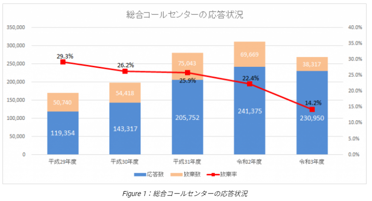 特にコロナ禍以降、ワクチン接種等に関する問合せなど、問合せ電話量は増加しており、2021年度(平成31年度)には年間約27万件/年にまで増加し、電話応答率は約86%で、約14%の電話は対応しきれずに放棄されていました。