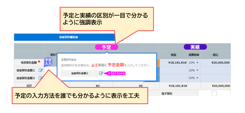 また、契約予定金額を入力せずに誤って契約実績金額を入力してしまうケースが発生していたのですが、その際は予定と実績の差分が一目でわかるようにツールチップを設置し、該当箇所の入力率が10%程度からほぼ100%へと大幅に改善されました。