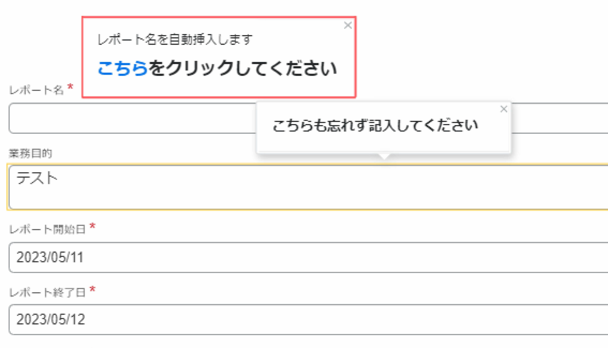 特に、「出張経費精算」のレポート新規作成では、ツールチップとオートフロー機能を活用することで、従業員が入力するレポート名の表記揺れを防止しています。