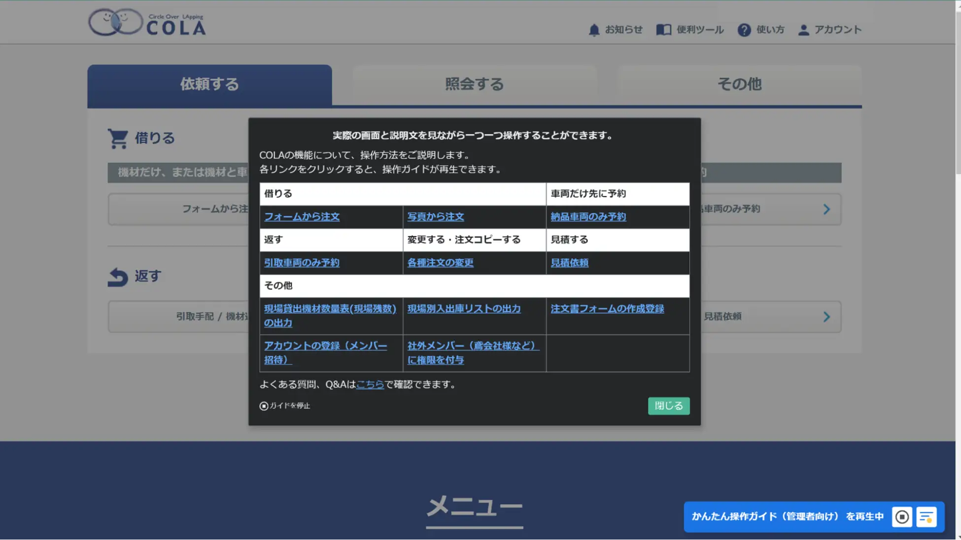 ・「COLA」の機能を一覧化し、利用方法を「ガイド」で案内