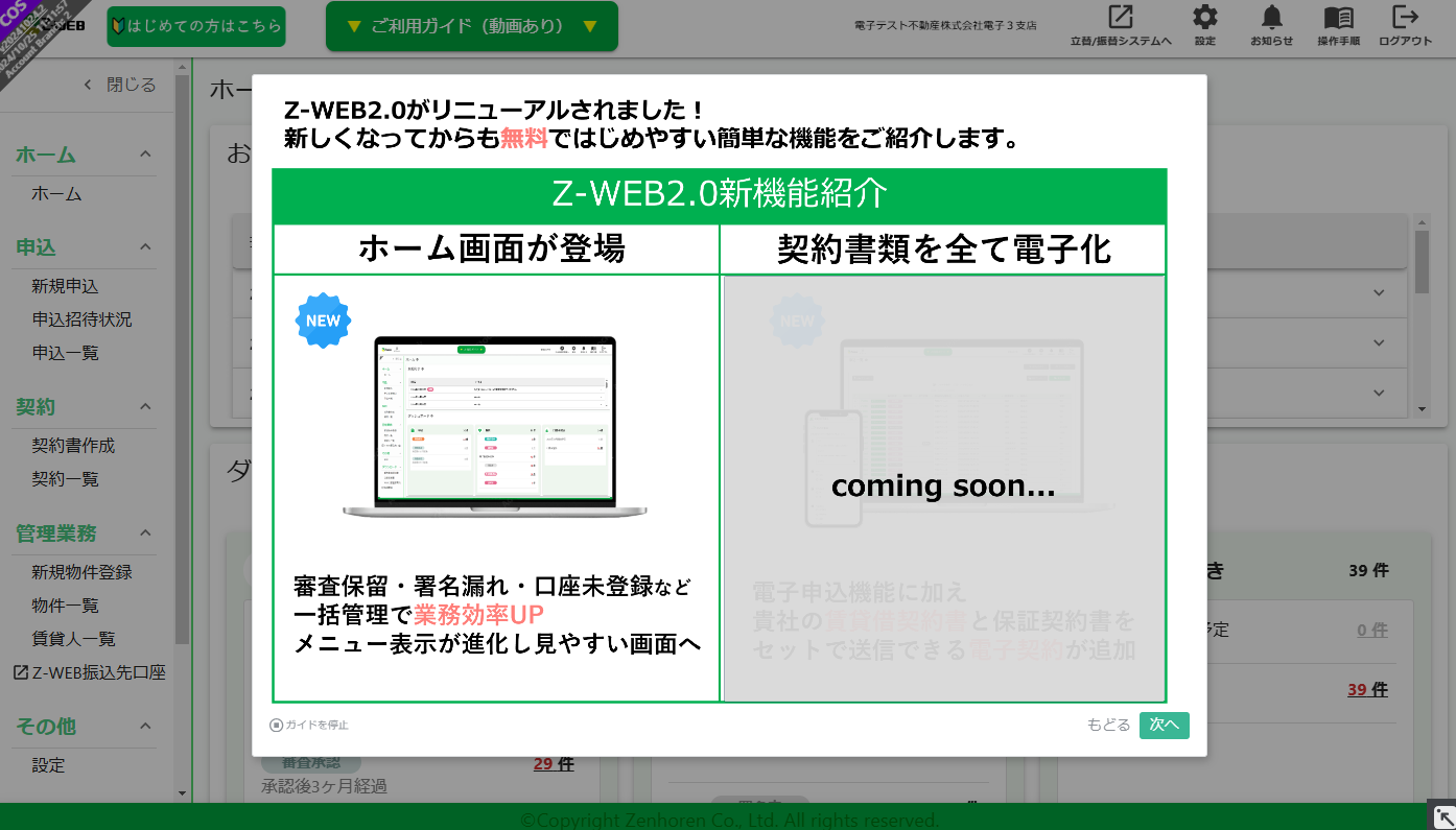 2023年6月から提供を開始した、不動産会社向けの家賃債務保証における管理システム「Z-WEB2.0」は、「必要な機能を、手厚くシンプルに提供する」をコンセプトにデジタル化による利便性の向上と業務効率化を実現します。今後も様々な契約管理機能の追加・アップデートを予定しており、管理会社をはじめ賃貸市場に関わる皆様にご満足いただけるサービスの提供に取り組みます。