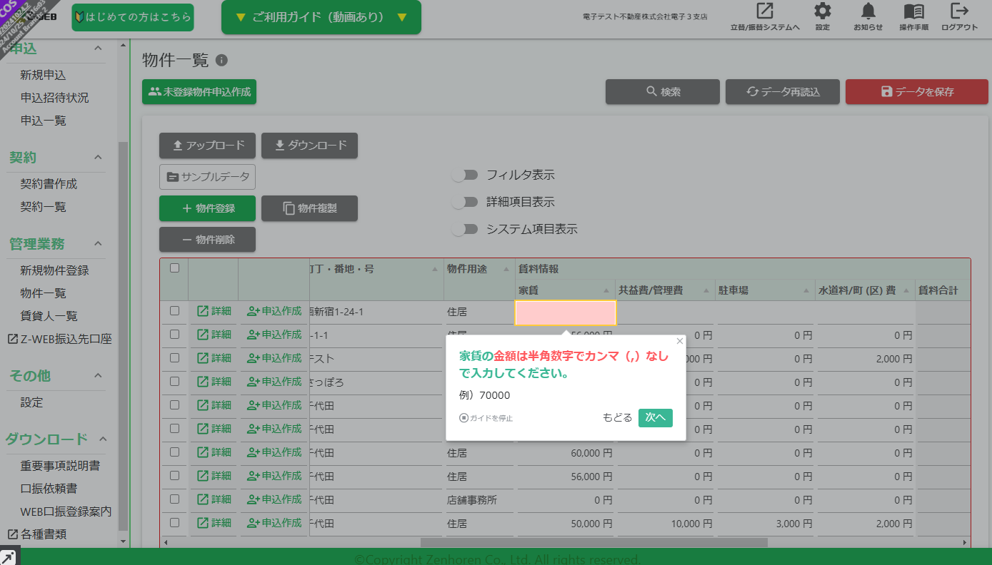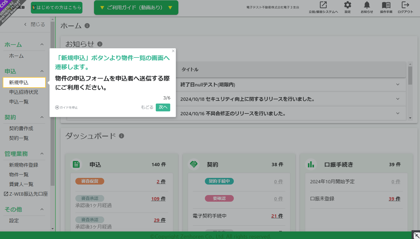 全保連が提供する「Z-WEB2.0」は、家賃債務保証サービスへの審査申込をWebで簡単に行える不動産会社向けの電子申込サービスです。24時間スマートフォンやパソコン上で物件情報やお客様情報の入力ができ、申込手続きの短縮が可能です。利用開始後に営業担当が操作説明を行いますが、「申込手続き前に離脱してしまう」「十分に機能が利用されていない」などの課題がありました。一方で、全てのユーザーに対して個別に操作案内をすることも難しく、解決手段を探していたなかで効率よく案内する手段として、「テックタッチ」が採用されました。「テックタッチ」は、Webシステム画面上でナビゲーションを作成・表示することができます。ナビゲーションを表示することで、「Z-WEB2.0」の便利な使い方や、有用な機能を直接ユーザーに案内できます。例えば、ユーザーが初めて「Z-WEB2.0」にログインした際に、「テックタッチ」で新機能やメリットを紹介でき、入力時の注意点を補足するなど、「Z-WEB2.0」の利用習熟・活用促進につながります。