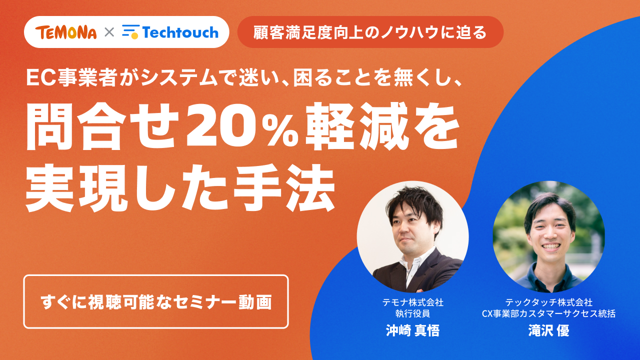 - テモナ社 事業紹介、事業推進における課題、テックタッチ活用事例