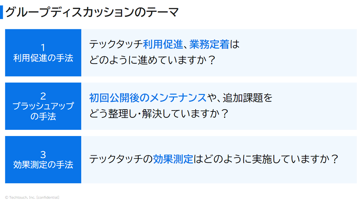 ・定量的な報告と定性的な評価を中心に各社の取り組み内容が共有され、定性面では特にアンケートに取り組む企業が多く「テックタッチがないと困るか」、「他システムでもテックタッチを利用したいか」等の設問で社内の意見を集めているといった例も。