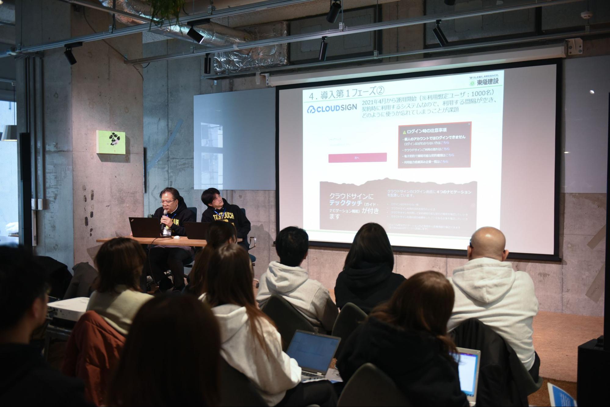 登壇者:東急建設株式会社 経営戦略本部 コーポレートデジタル推進部 システム運用グループ グループリーダー 遠藤様、東急テックソリューションズ株式会社 建設ソリューション事業部 部長 早川様